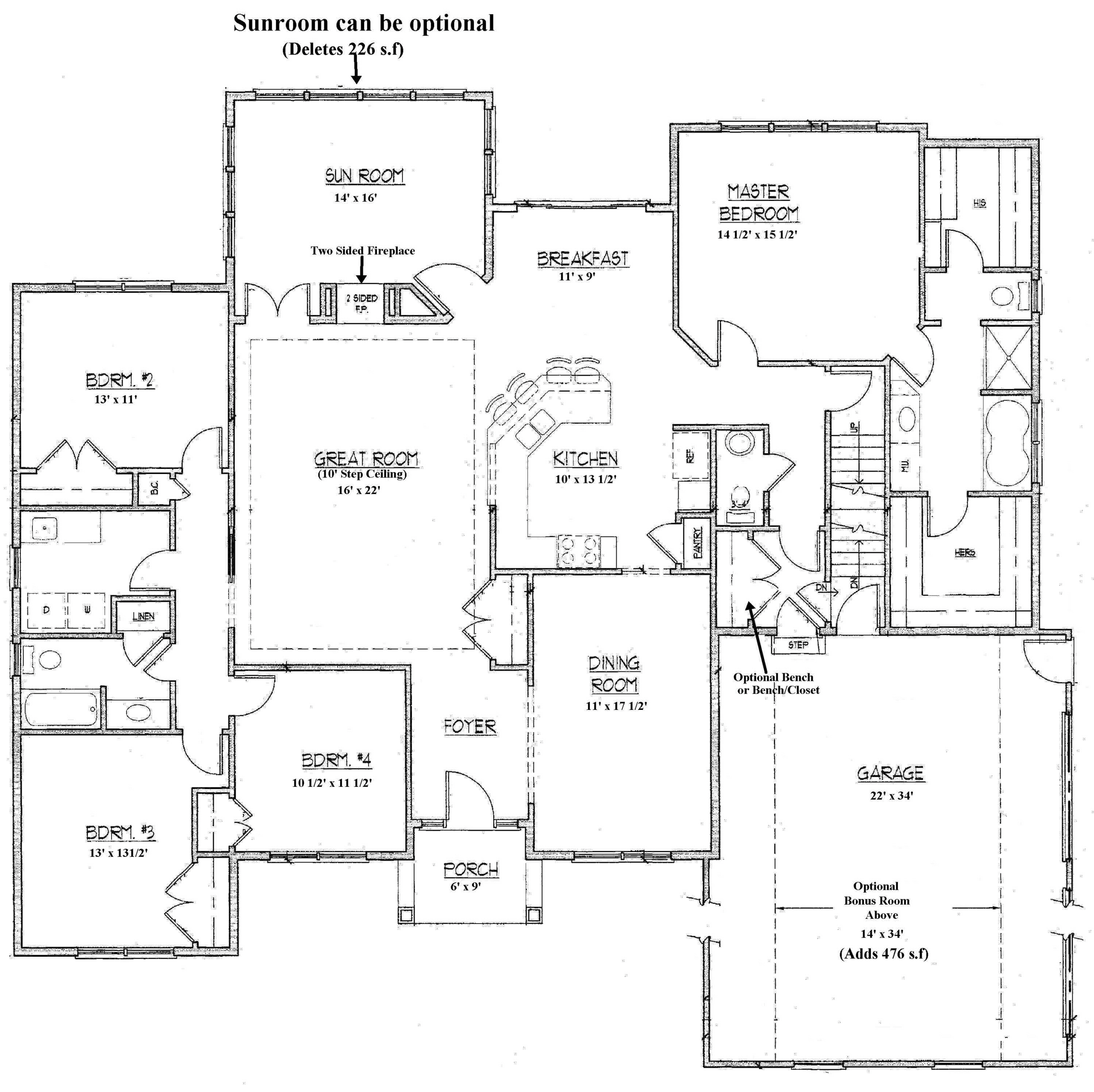 - Photos below are in a home without the sunroom and single sided fireplace. The photos show the optional bonus room.