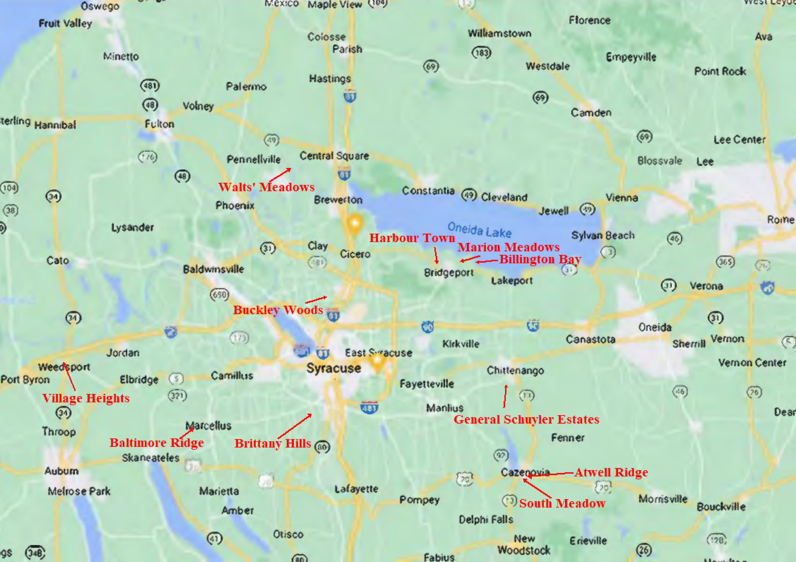 This upscale neighborhood is off Route 173, West of Route 11 (Salina St.) near the Community Campus of Syracuse University. It’s location is convenient to Syracuse hospitals and universities. This popular and beautiful community has all public utilites on 1/2 acre lots.
