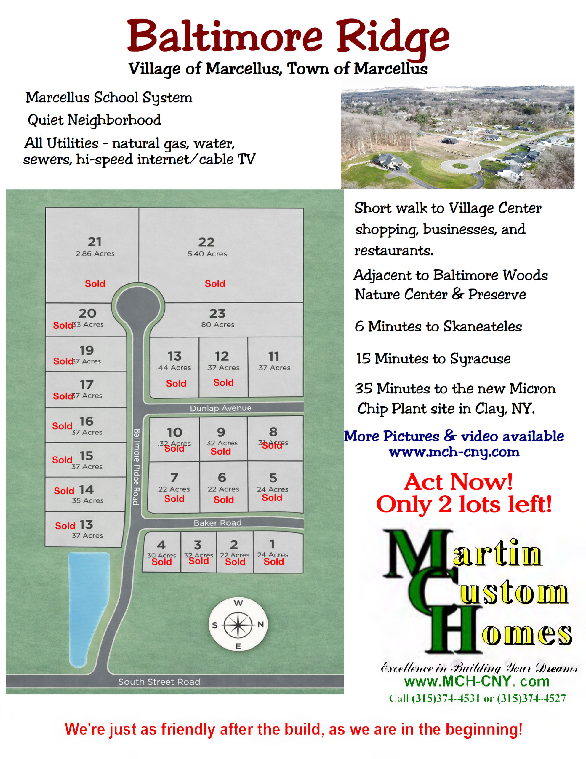 A quiet neighborhood within walking distance of the Marcellus Village Center, shopping, businesses, and restaurants. Just a 6 minute ride to Skaneateles, 15 minutes to Syracuse, and 35 minutes to the new Micron chip site. Only 2 lots left, 11 and 23. Act quickly if small town living is for you!